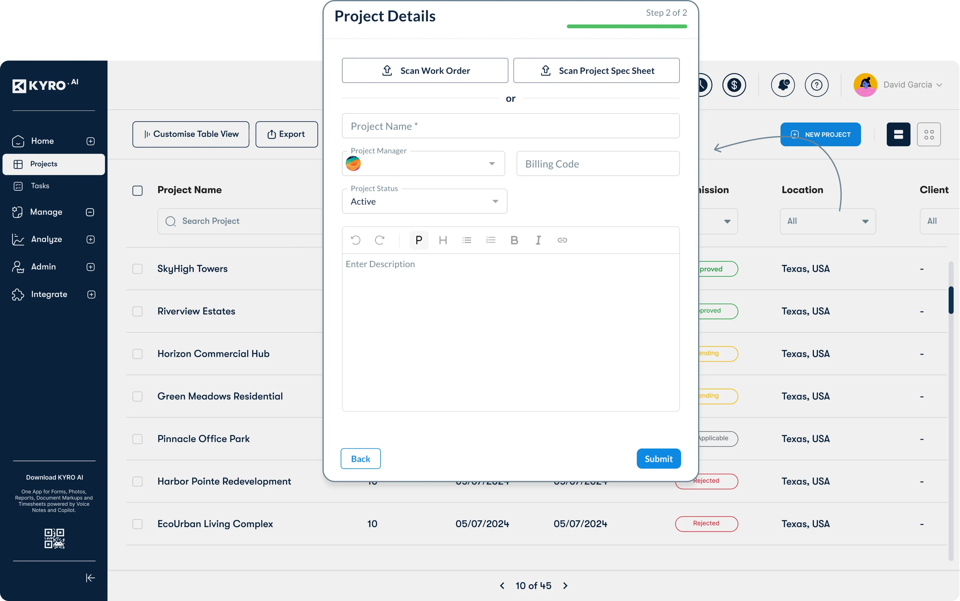 Accurately track labor hours and expenses with KYRO’s time and expense tracking. Ensure transparency, control costs, and maintain detailed records for easy project audits with our forms and dashboards.
